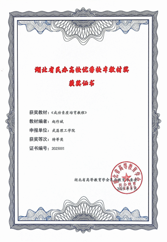 本次评选共评定获奖教材 38 部,其中特等奖3部、一等奖6部、二等奖10部、三等奖19部。对评选出的优秀校本教材,专委会将授予“湖北省民办高校优秀校本教材”称号,并颁发相应证书。武昌理工学院校长赵作斌教授编著的教材《成功素质培育教程》《大学生创新素质培育教程》均荣获特等奖。此外,武昌理工学院赵峰老师主编的《工程经济学(第四版)》,岳晓红等老师编写的《大学生劳动教育》荣获二等奖,李芬老师主编的《基础会计学》荣获三等奖。